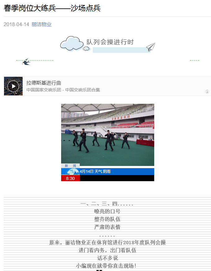 同心協(xié)力共創(chuàng)未來 ——2023麗潔橫店團(tuán)建拓展活動圓滿結(jié)束 秋意漸濃時(shí),載譽(yù)歸來季丨麗潔服務(wù)多個(gè)小區(qū)榮獲“六好小區(qū)”榮譽(yù) 月團(tuán)圓慶華誕 麗潔與您同樂 九江潯陽區(qū)召開無物業(yè)小區(qū)清零行動工作調(diào)度會 物業(yè)服務(wù)步入信用“軌道” 這個(gè)小區(qū)叒收到錦旗啦! 走進(jìn)物業(yè)“心臟”,感受“看不見”的服務(wù) 端午大放“粽”|你很“粽”要 抱團(tuán)打天下,逐夢向未來|2023年麗潔服務(wù)首次素質(zhì)拓展活動 這個(gè)春天,我們有個(gè)約會!