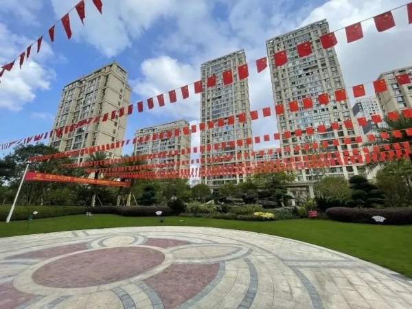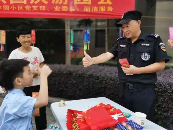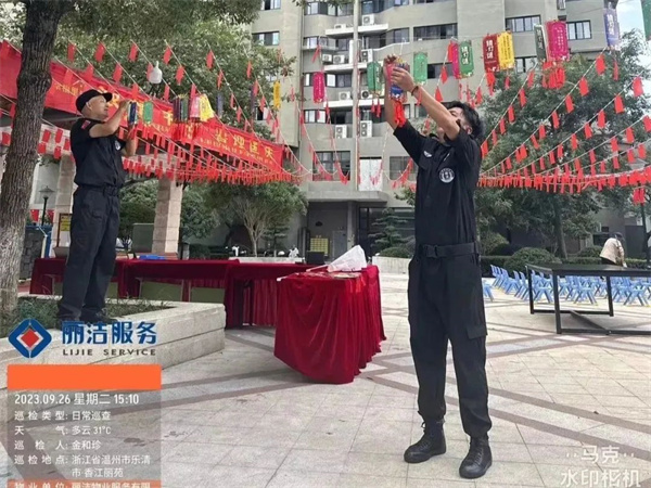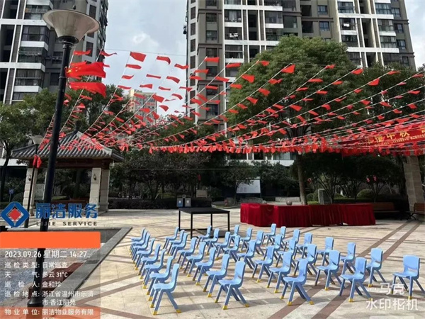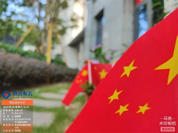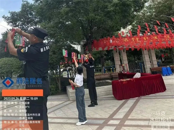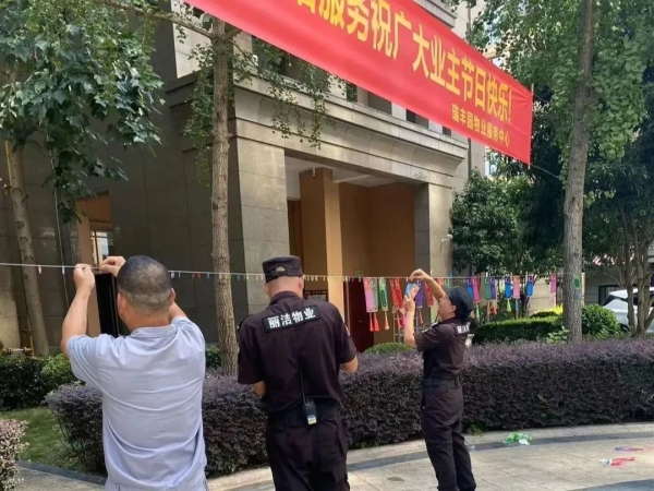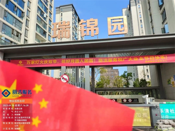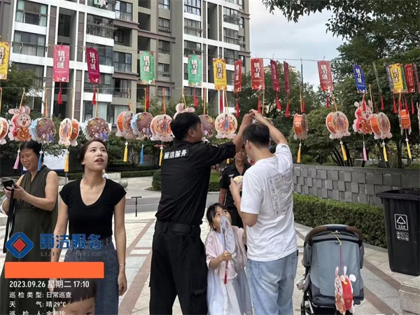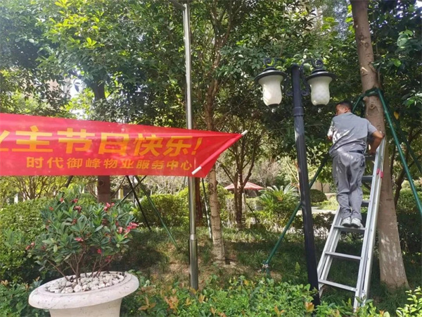 “良辰美景迎中秋 盛世華誕賀國慶”,為讓業主感受到中秋、國慶雙節的濃厚節日氛圍,麗潔服務工作人員提前在多個小區出入口、主干道等區域懸掛中秋國慶條幅及鮮紅的五星紅旗等裝飾,不僅扮靚了小區,也成為了一道靚麗的風景線,讓業主家人們感受到了濃濃的節日氣氛。